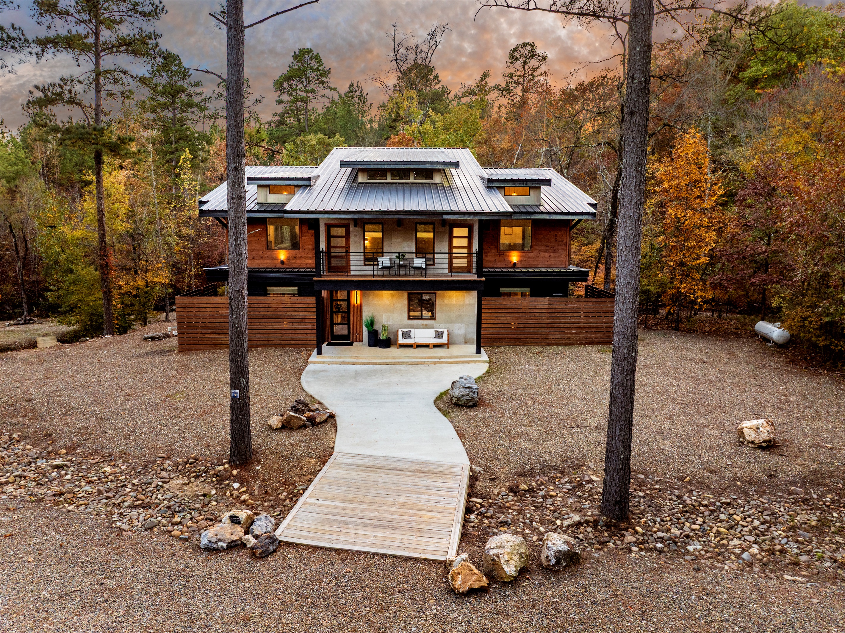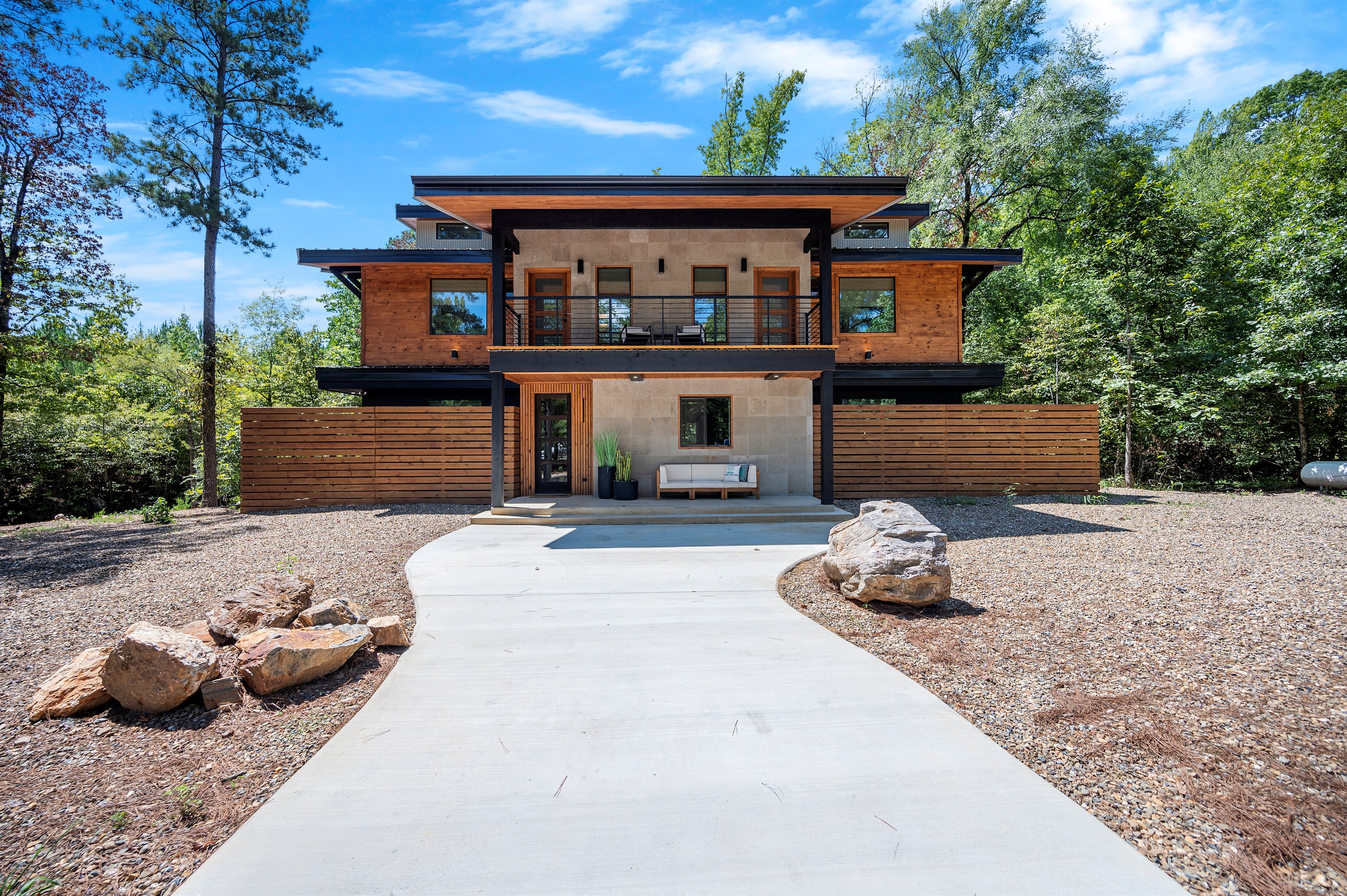 An exquisite blend of materials highlights Enchanted Creeks' aesthetic appeal, from the stone fireplace and floor-to-ceiling slat wall to the floating staircase, teak accents, modern sconces, and hardwood floors. The generous number of windows welcomes the beauty of the outdoors inside, flooding the space with natural light and providing ample seating for relaxation or quality time with loved ones. Designer touches enhance the comfort of the seating, creating a perfect setting for unwinding and savoring the day's offerings. Additionally, a conveniently placed guest bathroom is just steps away from the living and kitchen areas.