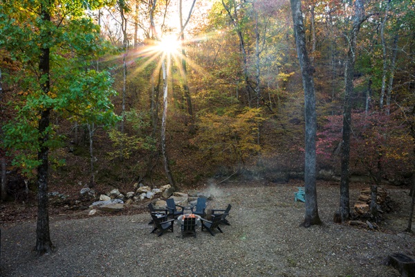 This is where nights slow down—pull up a chair, light the fire, and enjoy peaceful moments in the woods