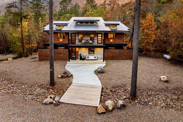 Your Hochatown getaway starts here—sleek design, peaceful woods, and a picture-perfect entrance at golden hour.
